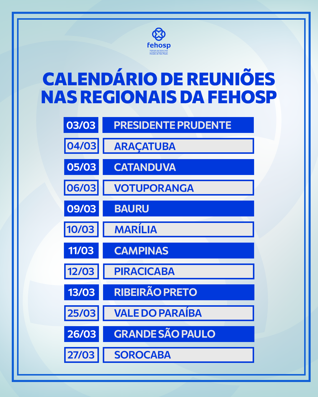 Calendário de reuniões nas Regionais da Fehosp