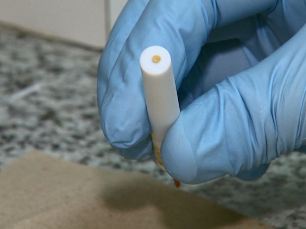 O sensor é formado por um bastão com um condutor elétrico e um disco de ouro de 2 mm na ponta. Uma amostra de sangue ou saliva é colocada em contato com o eletrodo e, se as partes não se juntarem naquele desenho clássico do DNA, a dupla hélice, significa que a pessoa não tem a mutação, não tem o defeito genético. Mas, se os fragmentos se juntarem, existe a tendência a desenvolver a doença.