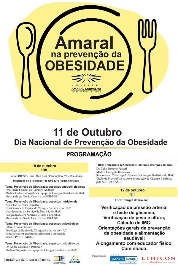 Para celebrar o Dia Nacional da Prevenção da Obesidade (11 de outubro), o Hospital Amaral Carvalho, de Jaú (SP), vai promover na próxima semana o “Amaral na Prevenção da Obesidade”. O evento é destinado à população de Jaú e região para orientação sobre os riscos dessa comorbidade e conscientização à qualidade de vida.