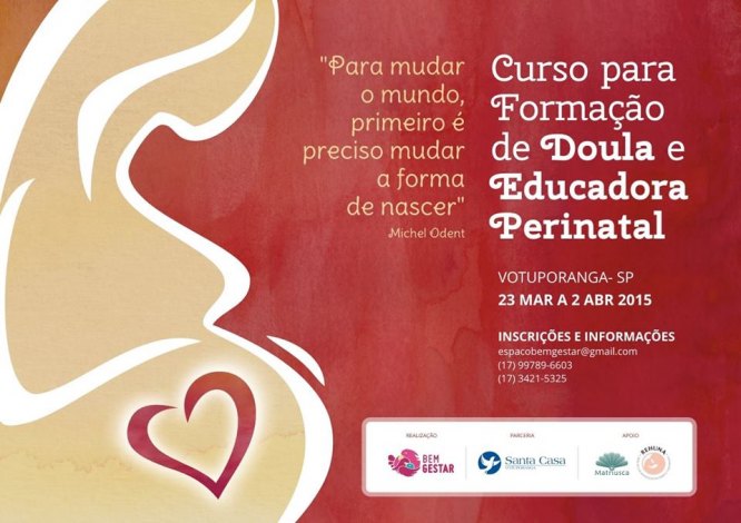 A edição será de 23 de março a 2 de abril, no Espaço Unifev, anexo a Santa Casa. O primeiro módulo, de 23 a 27 de março, acontecerá no período da manhã, e o segundo módulo, de 30 de março a 2 de abril, durante manhã e tarde, somando 80 horas. Inscrições no link www.bemgestar.wix.com/cursodoula ou pelo e-mail espacobemgestar@gmail e mais informações nos telefones (17) 99789 6603 e (17) 98211 3522.