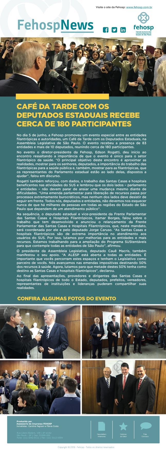 Em uma cerimônia repleta de profissionais dos nossos hospitais, a FEHOSP promoveu nas dependências da ALESP um café com os parlamentares. Na abertura do evento, o Presidente Edson Rogatti agradeceu a presença de todos, em particular aos parlamentares da ALESP pela simpática recepção e destacou: