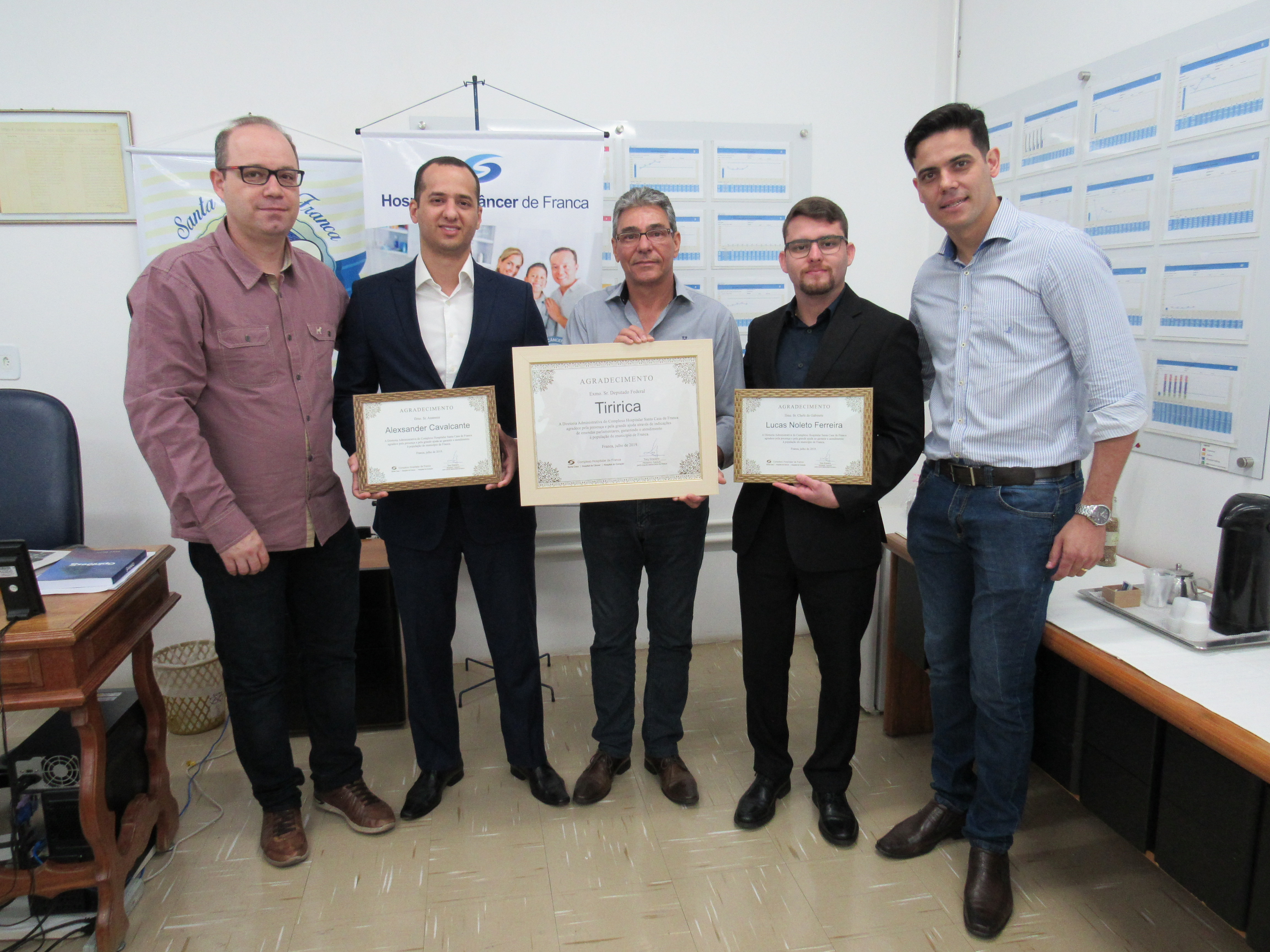 Após a apresentação, o presidente Tony Graciano fez a entrega de certificados de agradecimento e reconhecimento ao contínuo apoio do Deputado Federal Tiririca, pelas indicações de emendas parlamentares para custeio, que têm auxiliado o Complexo Santa Casa de Franca; também entregou certificados ao assessores Lucas e Alexsander por sempre receberem com grande acolhida os representantes do hospital no gabinete do deputado em Brasília/DF.