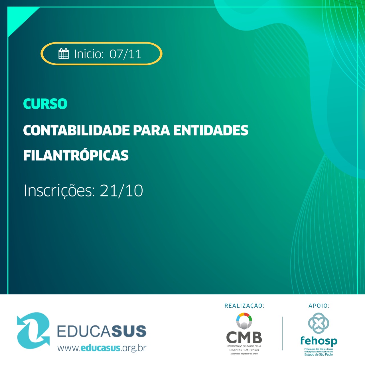 A Confederação das Santas Casas de Misericórdia, Hospitais e Entidades Filantrópicas (CMB), abre, no próximo dia 21, as inscrições para uma nova turma do curso Contabilidade para Entidades Filantrópicas (Turma III), por meio da plataforma Telemedicina/Educasus. Serão 50 vagas, com 24 horas, divididas em 8 horas presenciais e 16 em EAD (aulas EAD nos pontos de transmissão via satélite).