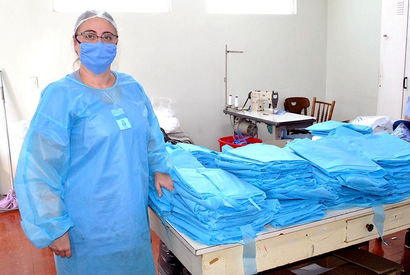 Andrea explica que o grupo conseguiu comprar 59 rolos do tecido e todos já estão em produção. Ela calcula que, com esse material, seja possível confeccionar 950 aventais.