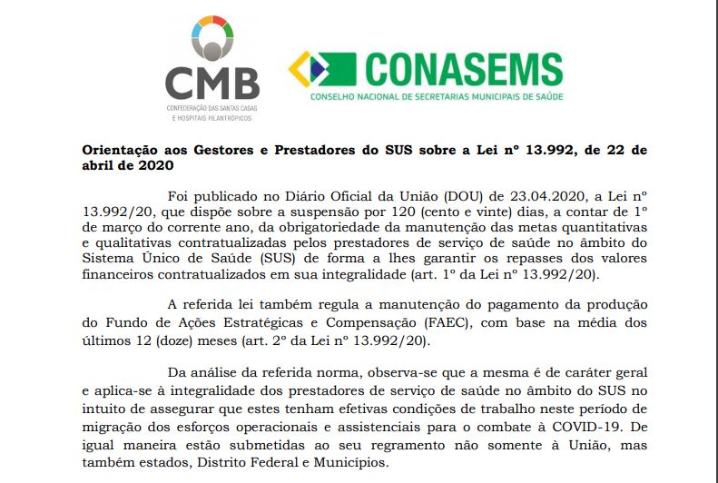 CMB E CONASEMS ORIENTAM GESTORES E PRESTADORES DO SUS SOBRE A LEI Nº 13.992/20