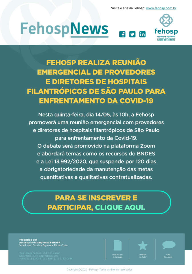 FEHOSP REALIZA REUNIÃO EMERGENCIAL DE PROVEDORES E DIRETORES DE HOSPITAIS FILANTRÓPICOS DE SÃO PAULO PARA ENFRENTAMENTO DA COVID-19
