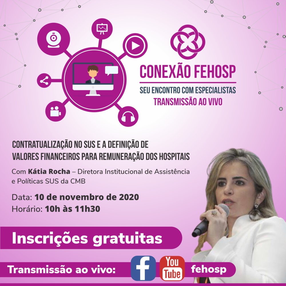 Na próxima terça-feira, dia 10/11, será realizada mais uma edição do Conexão Fehosp, das 10h às 11h30. O tema do encontro será a contratualização no SUS e a definição de valores financeiros para remuneração dos hospitais.
