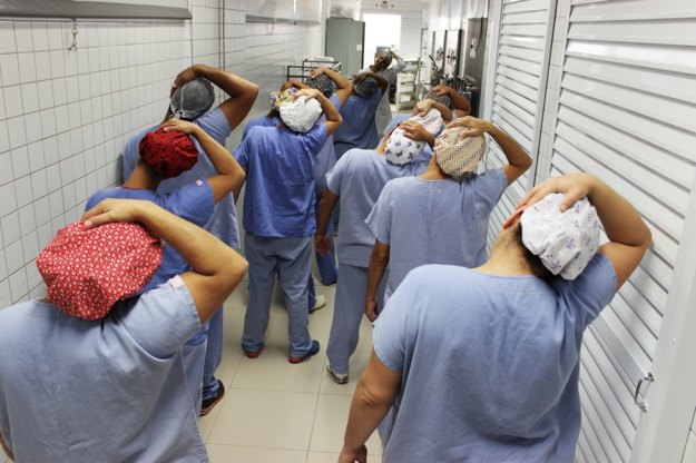 A fisioterapeuta percorre os setores do HAC para orientar os funcionários sobre exercícios que devem ser repetidos pelo menos uma vez ao dia. “São atividades leves aplicadas aos grupos musculares mais acometidos, de acordo com o trabalho realizado”, conta Maria Luiza.