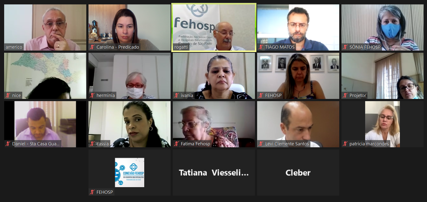 Na terça-feira, 02/02, toda a equipe técnica da Fehosp e seu diretor-presidente, Edson Rogatti, realizaram uma reunião online com as entidades associadas Santa Casa Anna Cintra de Amparo, Santa Casa de Riolândia, Hospital Cruz Azul – São Paulo, Santa Casa de Guararapes, Santa Casa de Bastos e Santa Casa de Descalvado.