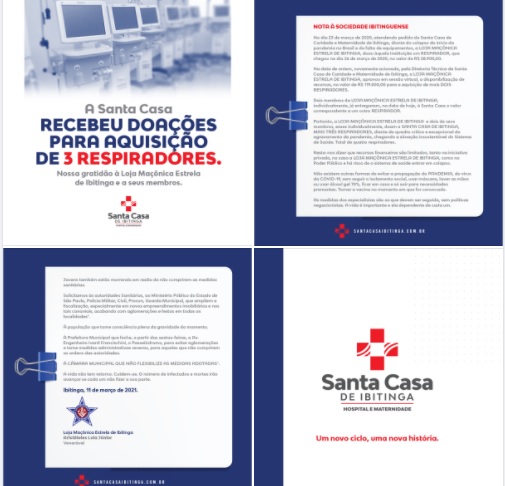 É válido lembrar, também, que no começo da pandemia, no dia 23 de março de 2020, a Loja Maçônica Estrela de Ibitinga doou à nossa instituição um respirador no valor de R$58.900,00 para auxiliar no tratamento de pacientes acometidos pelo novo coronavírus.