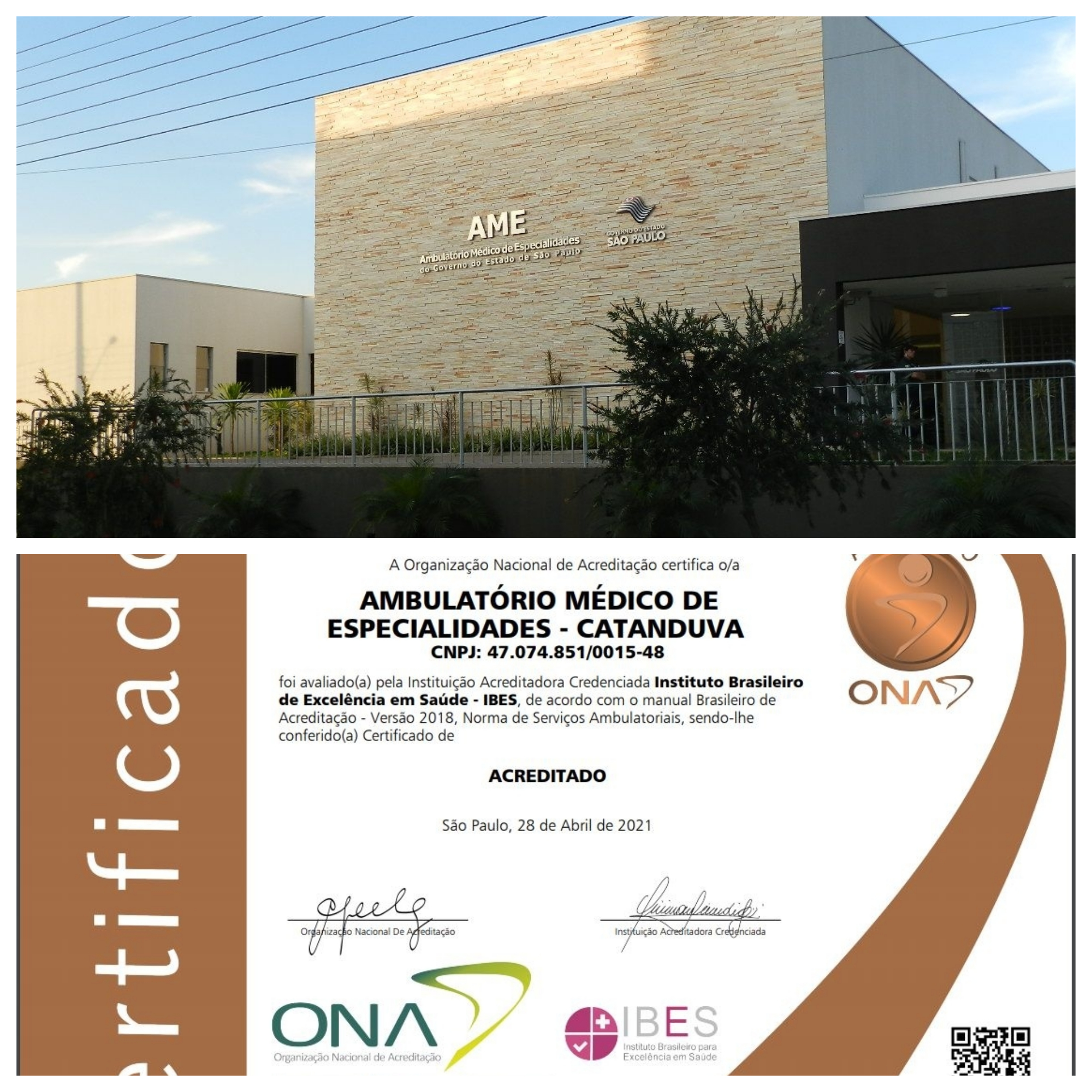 O Ambulatório Médico de Especialidades/AME Catanduva, sob gestão da Fundação Padre Albino, acaba de ser Acreditado no Nível I (segurança) pela ONA/Organização Nacional de Acreditação, entidade não governamental e sem fins lucrativos que certifica a qualidade de serviços de saúde no Brasil com foco na segurança do paciente. A Acreditação tem validade até 28/4/2023. O AME Catanduva foi avaliado pela instituição acreditadora IBES/Instituto Brasileiro para Excelência em Saúde, de acordo com o Manual Brasileiro de Acreditação, versão 2018, Normas de Serviços Ambulatoriais.