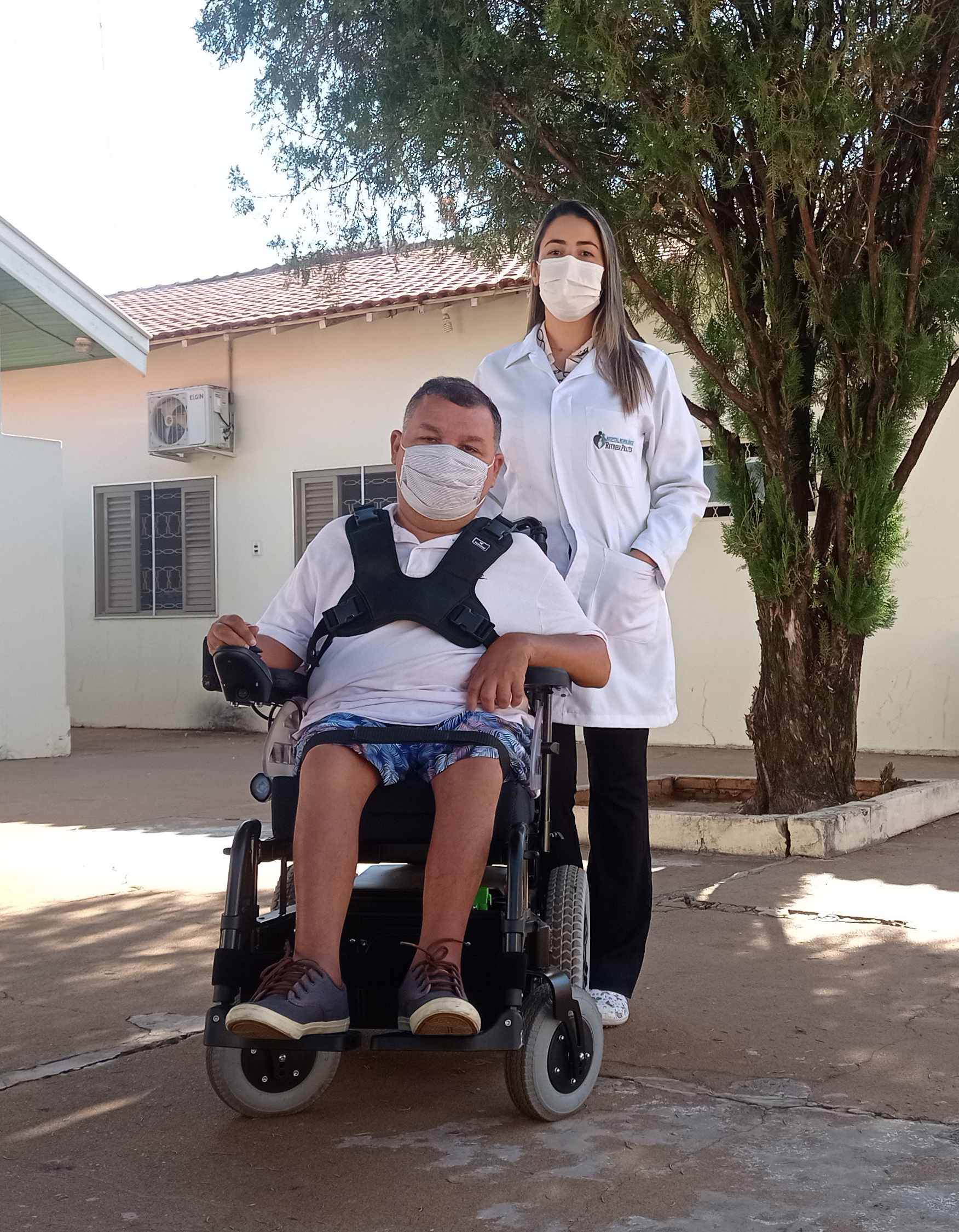 A fisioterapeuta Natália Clemente Batista, que atende o usuário, explica que o tratamento semanal de Lemos inclui, além de fisioterapia para manutenção dos sistemas motor e respiratório, atendimento com ortopedista e psicóloga. Ela também comenta que a cadeira dispensada a ele foi adaptada na unidade para proporcionar mais conforto. “Adaptamos apoios de braços, assento anatômico e cinto de segurança para o tronco. Tudo para deixar o equipamento mais funcional, para melhorar o desempenho dele no uso do dispositivo”, comenta Natália. De acordo com a profissional, antes de retirar a cadeira de rodas, o usuário passa por treinamentos para o uso seguro do equipamento. “Nós treinamos os usuários pelo tempo que for necessário. Esse treino é realizado em diferentes terrenos, simulando situações e dificuldades que o usuário passa diariamente. E o dispositivo é dispensado no momento que o paciente está apto para conduzir a cadeira sem trazer riscos a ele e a terceiros.”