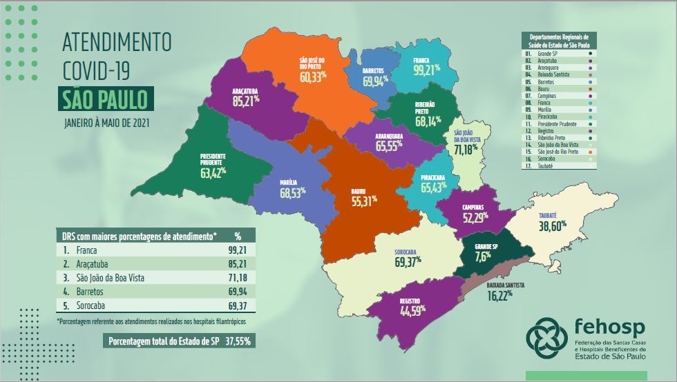 De janeiro a maio, período mais crítico da pandemia da Covid-19, as Santas Casas e hospitais filantrópicos deram importante suporte e atenderam à mais da metade dos casos da doença. Há instituições do setor que foram responsáveis por 99,2% dos atendimentos, como as que integram a DRS (Departamentos Regionais de Saúde) de Franca. Outras DRS's em que os hospitais filantrópicos se destacaram com o maior percentual de atendimento são Araçatuba (85,2%); São João da Boa Vista (71,1%); Barretos (69,9%); e Sorocaba (69,3%).