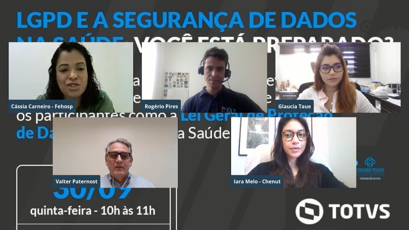 Nesta quinta-feira (28), o Conexão Fehosp, juntamente com a Totvs, promoveu mais uma discussão, abordando o tema “LGPD e a Segurança de Dados na Saúde’’. O debate contou com a participação de Rogério Pires, diretor de healthcare da Totvs, Glaucia Taue, consultora de negócios na Totvs, Iara Peixoto Melo, head de direito digital e proteção de dados na Chenut Oliveira Santiago, e Valter B. Paternost, gerente de projetos e tecnologia da Santa Casa de São José do Rio Preto.