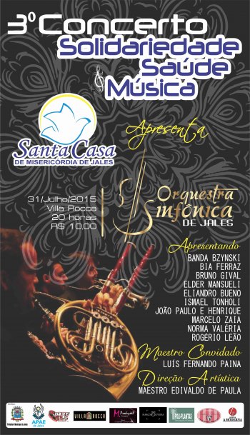 O maestro e responsável pela organização do 3° Concerto “Solidariedade, Saúde e Música”, Edivaldo de Paula, adiantou que será uma apresentação cheio de surpresas e promete emocionar o publico. “Neste ano daremos a oportunidade para que novos talentos musicais de nossa cidade participem deste grandioso evento promovido em parceria com a Santa Casa de Jales, Orquestra Sinfônica e Prefeitura Municipal. Preparamos um repertório que agrega vários estilos musicais como temas de filmes, musicais, rock nacional e internacional, MPB e Sertanejo”.