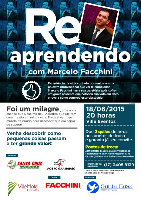 O provedor da Santa Casa de Votuporanga, Valmir Antônio Dornelas, convida a população da cidade e região para a palestra com o empresário Marcelo Facchini. Com o tema “Reaprendendo com Marcelo Facchini”, o evento é nessa quinta-feira, dia 18 de junho, às 20 horas, no Ville Eventos e a entrada é 2 kg de arroz. Vale ressaltar que as vagas são limitadas. Os convites ainda podem ser trocados até as 17 horas na Administração do Hospital, após esse horário, apenas na entrada da palestra.