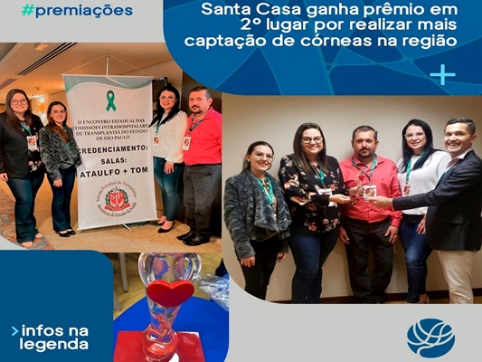 A Santa Casa realizou sete captações de córneas de janeiro até agosto deste ano. Neste período, também ocorreu um procedimento de múltiplos órgãos, envolvendo córneas, fígado, rins e válvula cardíaca. Foram 12 pacientes beneficiados, ganhando qualidade de vida. “Queremos estender esse troféu a todos do Hospitale administração da Instituição. A colaboração e apoio são fundamentais para esses procedimentos serem bem executados”, complementou.
