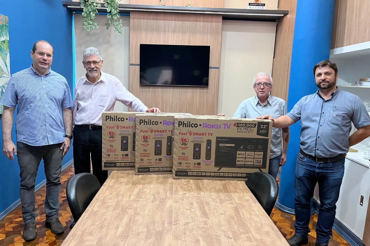 Os televisores foram entregues aos diretores da Santa Casa, Nelson Gratão (procurador jurídico), Juliano Tonon (conselheiro) e ao administrador Luiz Otávio Barbosa Vianna.