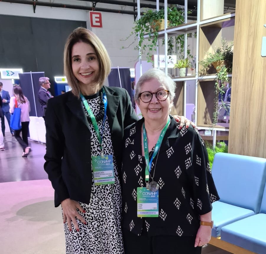 A gerente técnica da Fehosp, Maria Fátima da Conceição, esteve presente em mais um dia do Congresso Nacional dos Hospitais Privados (CONAHP), maior congresso de saúde do Brasil, promovido pela Associação Nacional de Hospitais Privados (Anahp). Ao lado dela estava Elissandra Motta, do departamento técnico da Fehosp.