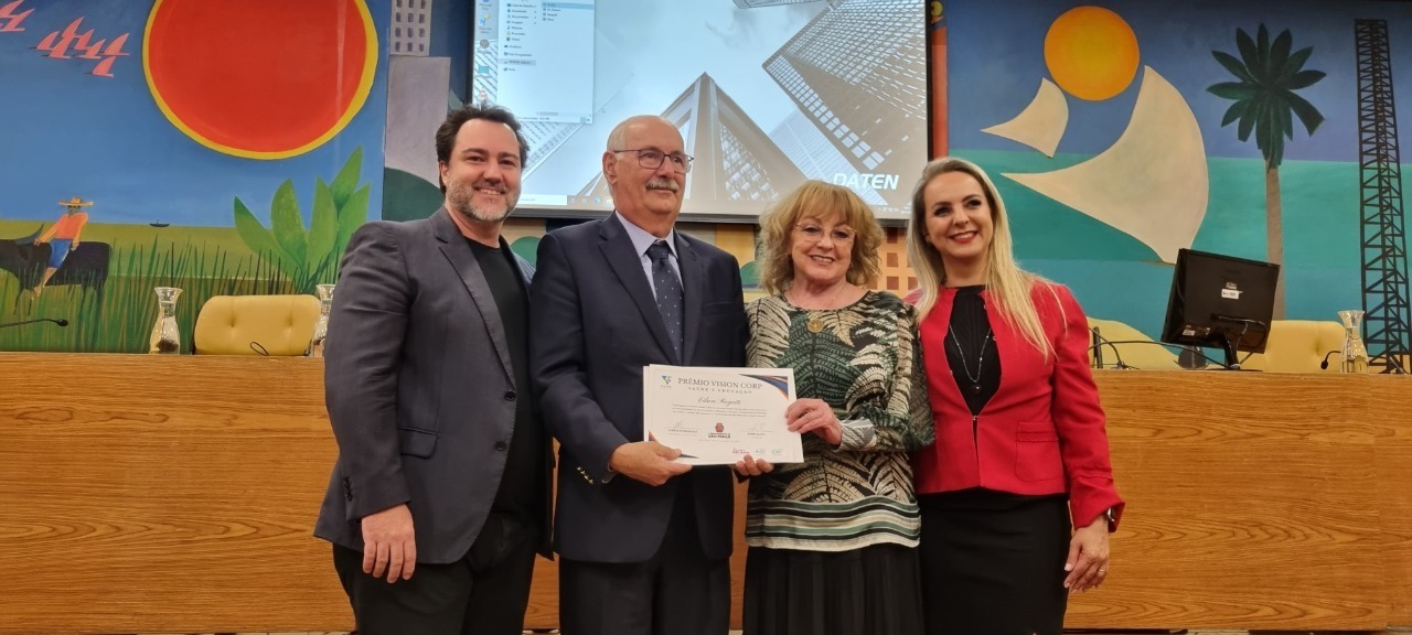Na ocasião, o prêmio foi entregue pelo presidente da Vision Corp, Vinicius Martins Pedroso, pela vice-presidente Ana Paula Pedroso, e pela Vereadora Edir Sales, anfitriã do evento.