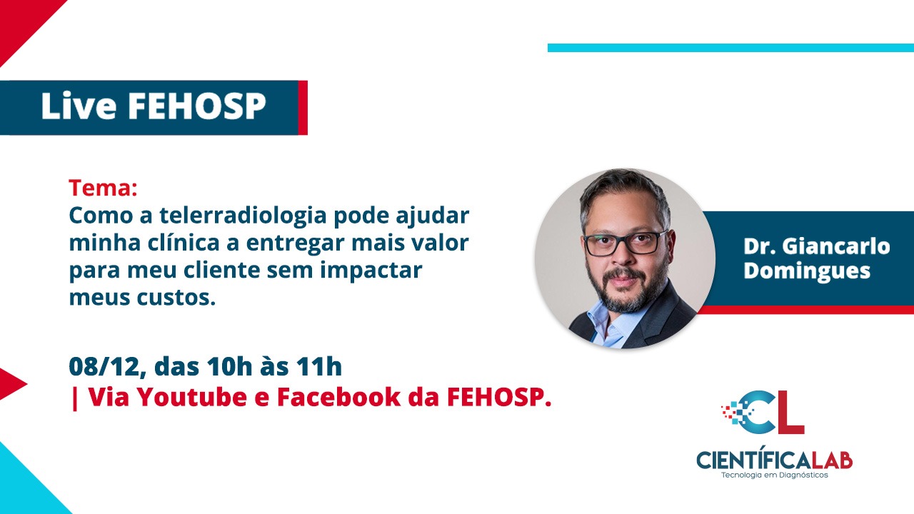 Nesta quinta-feira (08/12) às 10h, o Conexão Fehosp será realizado em parceria com o Científica Lab. Na ocasião, o Dr. Giancarlo Domingues trará o debate “Como a telerradiologia pode ajudar minha clínica a entregar mais valor para meu cliente sem impactar meus custos”.