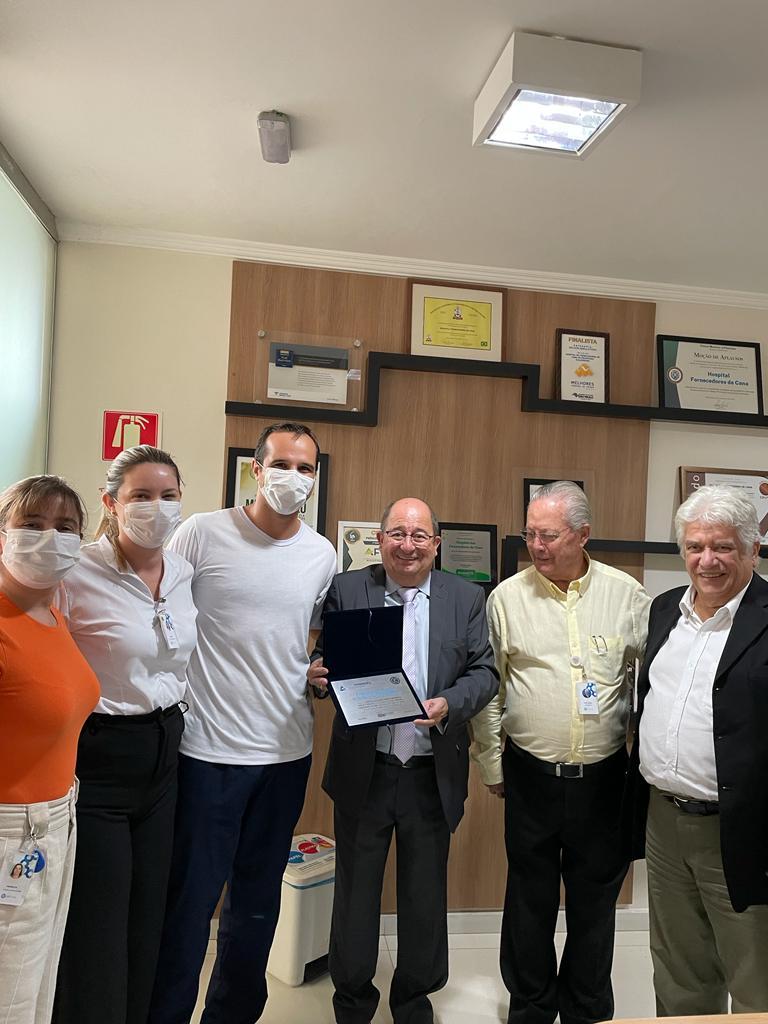 O presidente do Sindhosfil – Sindicato das Santas Casas de Misericórdia e Hospitais Filantrópicos do Estado de São Paulo, Edison Ferreira da Silva e o vice-presidente Jaime Durigon estiveram com a diretoria do HFC Saúde para fazer a entrega do prêmio para a equipe do hospital.