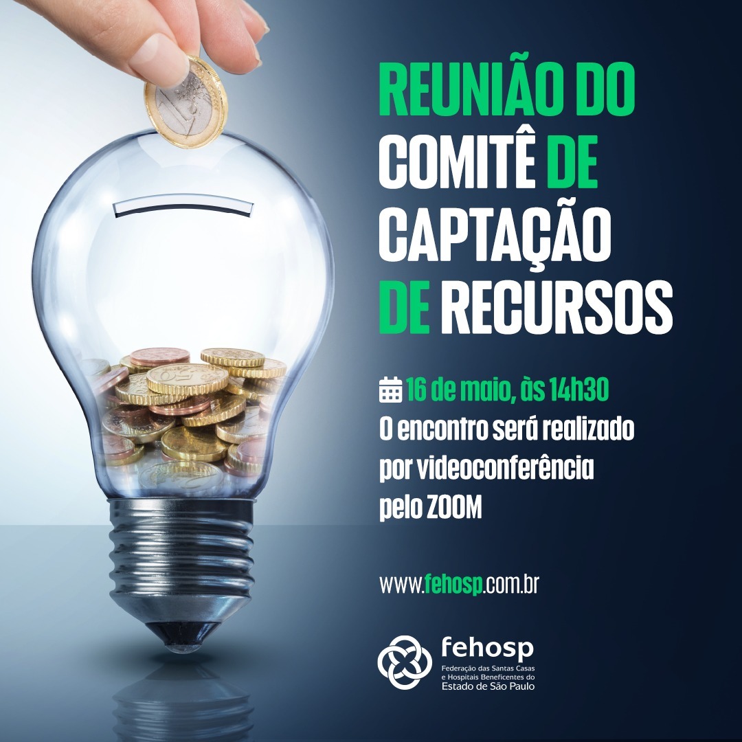 Na próxima terça-feira (16) será promovida reunião do Comitê de Captação de Recursos da Fehosp, por meio de videoconferência pela plataforma Zoom, a partir das 14h30.