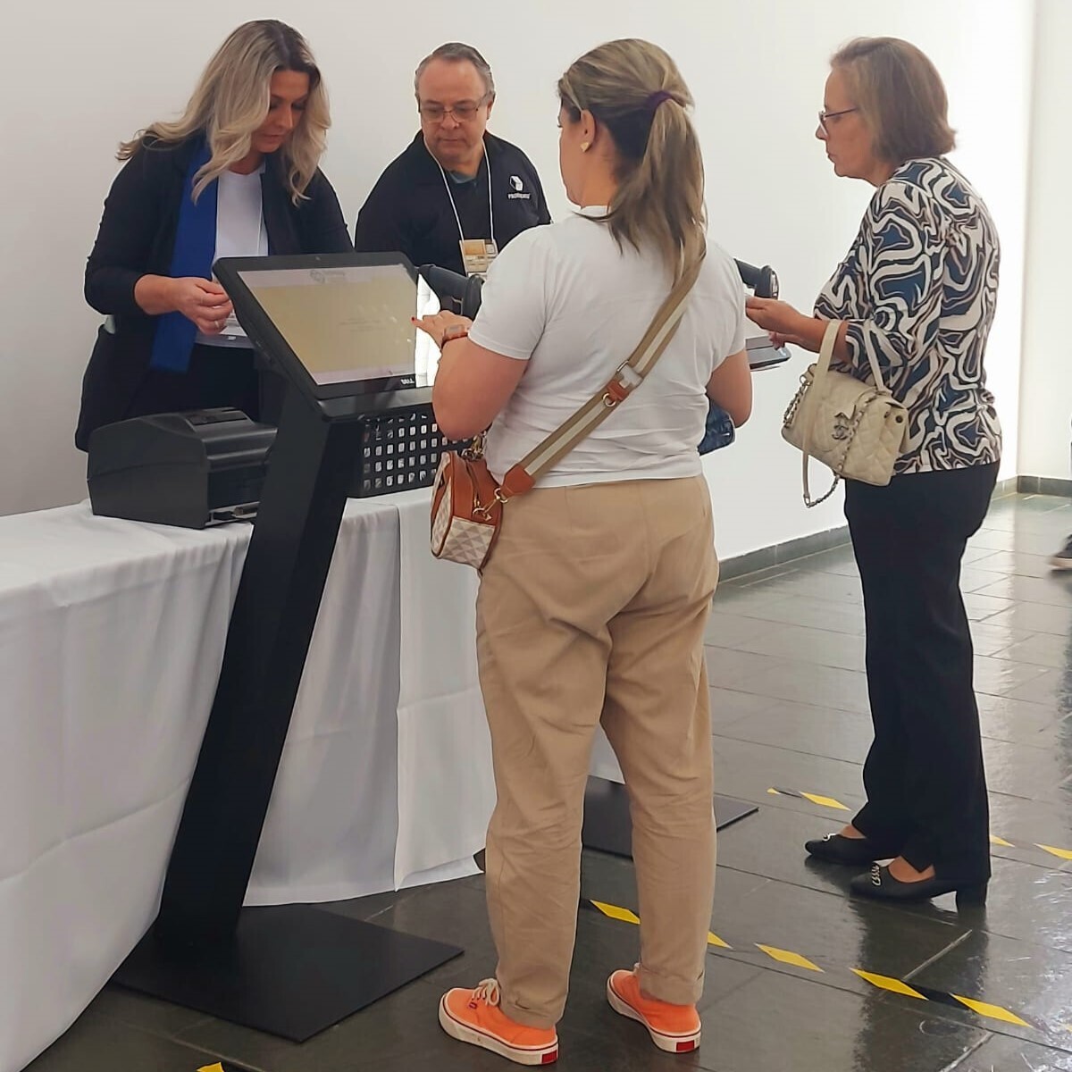 Nesta manhã, a secretaria do evento reúne dezenas de pessoas para o credenciamento, momento em que os participantes recebem um folder com toda a programação, para facilitar a conferência das apresentações.