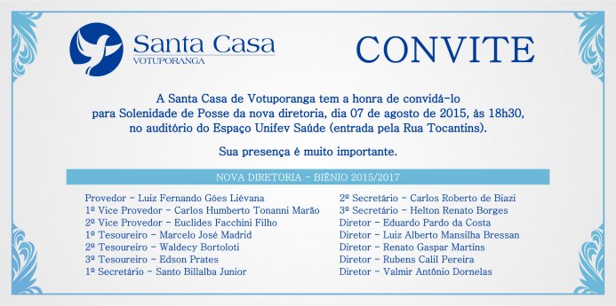 A Santa Casa de Votuporanga realiza nessa sexta-feira, dia 7 de agosto, a solenidade de posse da nova diretoria, biênio 2015/2017. A cerimônia terá início às 18h30, no Espaço Unifev Saúde e é aberta para toda comunidade. Vale ressaltar que a diretoria é composta por membros da comunidade, que se dedicam voluntariamente em prol do desenvolvimento e melhoria da entidade.