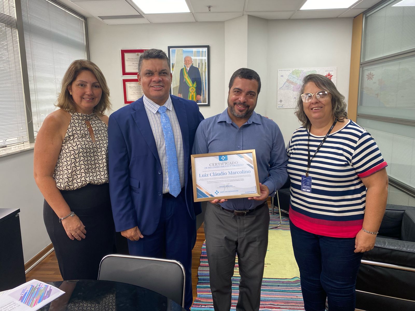 O deputado estadual Luiz Claudio Marcolino (PT/SP) recebeu de Marcos Andrade, relações institucionais da Irmandade Santa Casa de Piracicaba, um certificado de reconhecimento pela destinação, por emenda impositiva, de R$ 100 mil ao hospital, para o custeio de despesas com pacientes do Sistema Único de Saúde (SUS).