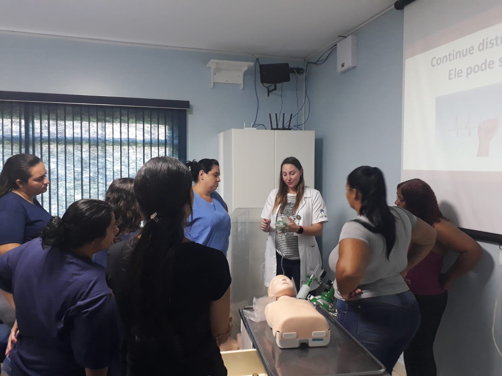 Sob a orientação da enfermeira responsável do Serviço de Enfermagem, Juliana Fachim, os cuidadores receberam instruções teóricas e práticas sobre procedimentos, como ressuscitação cardiopulmonar (RCP), controle de sangramentos e manuseio de obstrução das vias aéreas.