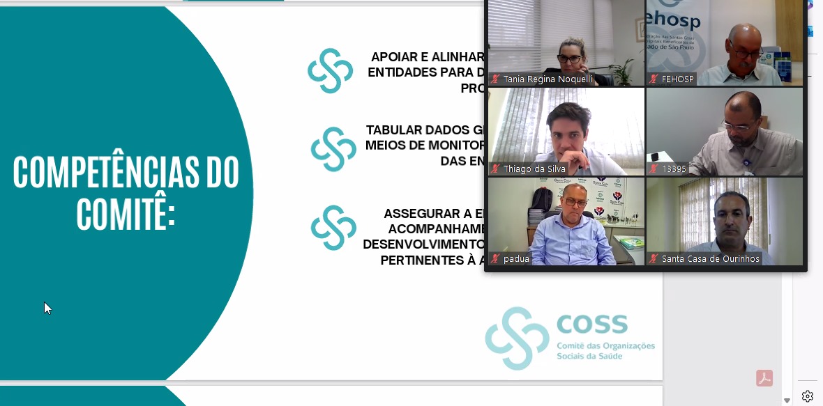 A reunião online contou com a efetiva participação de Edson Rogatti, diretor-presidente da Fehosp; Anis Ghattas Mitri Filho, membro do conselho de administração da Federação e organizador do COSS; Letícia Turim e Amanda Melone, assessoras jurídicas do Comitê; e Elissandra Mota, assistente do departamento técnico da Fehosp.