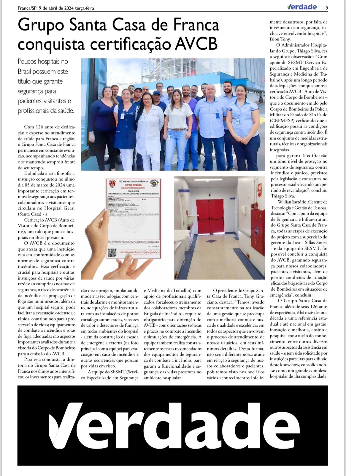 E alinhada a esta filosofia a instituição conquistou no último dia 05 de março de 2024 uma importante certificação em termos de segurança aos pacientes, colaboradores e visitantes que circulam no Hospital Geral (Santa Casa) – a Certificação AVCB (Auto de Vistoria do Corpo de Bombeiros), um tulo que poucos hospitais no Brasil possuem.