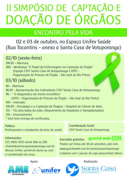 A Santa Casa de Votuporanga inicia nessa sexta-feira, dia 2 de outubro, a segunda edição do Simpósio de Captação e Doação de Órgãos. A abertura do evento será às 19h30, no Espaço Unifev Saúde, com o workshop “O Papel da Enfermagem na Captação de Órgão”. As inscrições são gratuitas e também serão feitas na entrada, mas se possível, os participantes podem contribuir com a doação de 1 pacote de copo descartável de 180 ml, que será destinado ao Hospital.