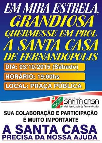 Neste sábado, dia 3, a comunidade de Mira Estrela se une para realizar a tradicional quermesse em do Hospital de Ensino Santa Casa de Fernandópolis. O evento será na praça central “Cândido Brasil Estrela” à partir das 19h. Com o apoio da Prefeitura e Câmara Municipal da cidade, cerca de 70 voluntários somam esforços para a realização da quermesse, cujo objetivo é angariar fundos que serão utilizados para melhorias na Santa Casa de Fernandópolis.