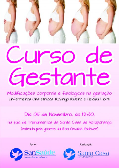 A Santa Casa de Votuporanga, em parceria com o Sansaúde, promove nessa quinta-feira, dia 5 de novembro, mais uma edição do curso de Gestantes. O tema do encontro será “Modificações corporais e fisiológicas na gestação” e podem participar usuárias do Hospital, convênios e mulheres de toda a comunidade, no período gestacional ou que se tornaram mãe recentemente.