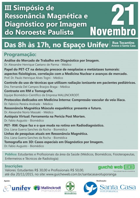 A Santa Casa de Votuporanga realiza nesse mês de novembro a terceira edição do Simpósio de Ressonância Magnética e Diagnóstico por Imagem do Noroeste Paulista. O evento será no dia 21 (sábado), das 8h às 17h, no Espaço Unifev Saúde e é destinado para estudantes e profissionais da área de saúde (Médicos, Biomédicos, Fisioterapeutas, Enfermeiros e Técnicos em Radiologia) e as inscrições já estão abertas.