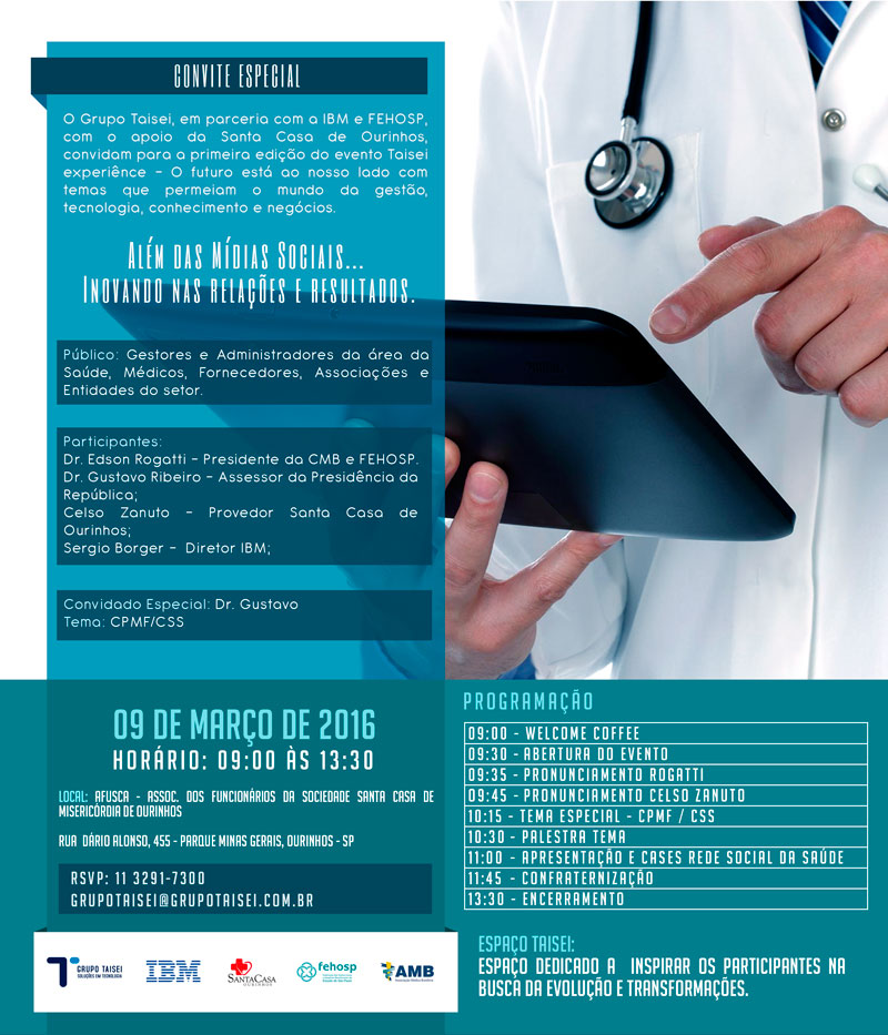 Com entusiasmo, a Fehosp retransmite o convite para o evento Taisei Experience, que será realizado para o segmento de saúde, na região de Ourinhos. Esse evento conquistou o apoio da Fehosp, da Associação Médica Brasileira (AMB), da IBM e da Santa Casa de Ourinhos com objetivo de reunir instituições de saúde, que unidas, poderão viabilizar importantes inovações tecnológicas.