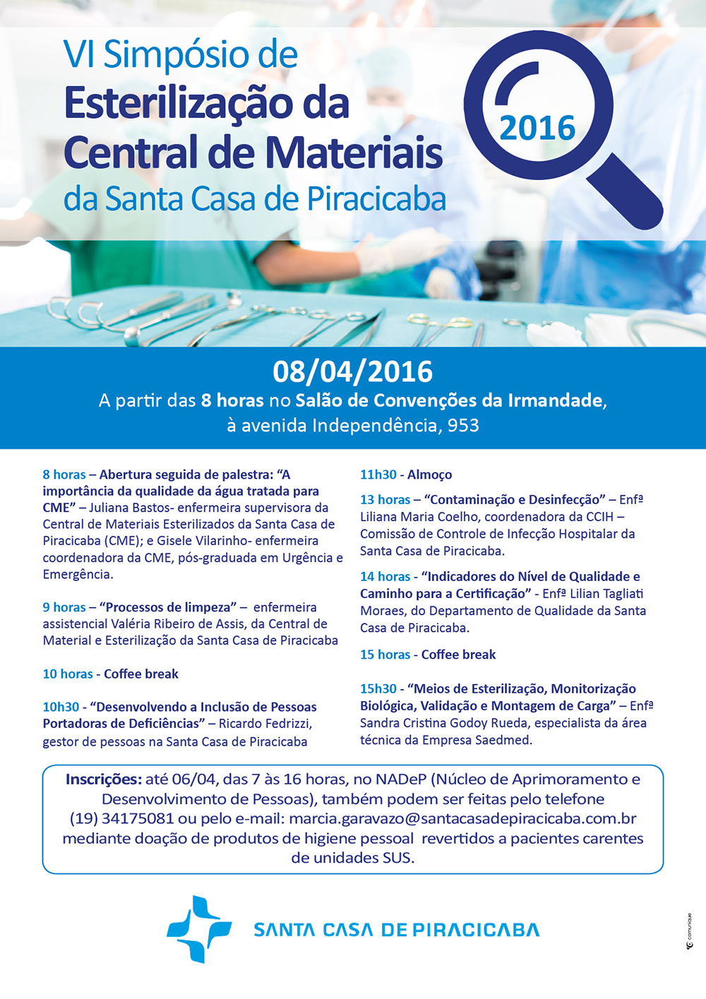 Inscrições: até 06/04, das 7 às 16 horas, no NADeP (Núcleo de Aprimoramento e Desenvolvimento de Pessoas), também podem pelo telefone (19) 34175081 ou pelo e-mail: marcia.garavazo@santacasadepiracicaba.com.br mediante doação de produtos de higiene pessaol revertidos a paciente carentes de unidade SUS.