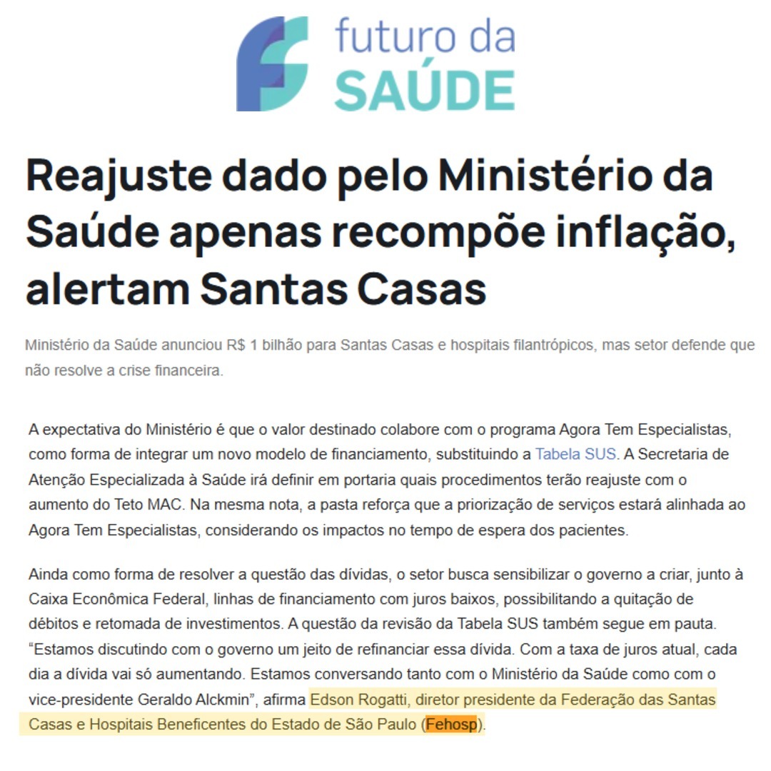 Fehosp comenta no portal Futuro da Saúde sobre reajuste do Ministério da Saúde para Santas Casas
