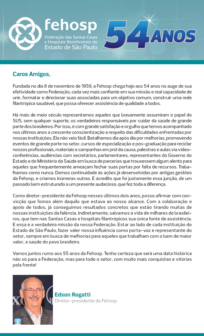 Em 1963, por exemplo, a Fehosp foi fundamental para a criação da Confederação das Santas Casas de Misericórdia, Hospitais e Entidades Filantrópicas (CMB), que reúne atualmente todas as demais federações do país.
